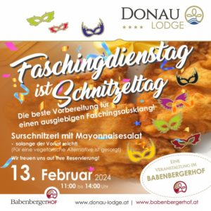 ![]() SURSCHNITZERL AM FASCHINGDIENSTAG! Heuer gibt´s Surschnitzerl bei uns, solange der Vorrat reicht! Wir freuen uns auf einen tollen Faschingsumzug in Ybbs – mit vielen lustigen Teilnehmern! Lassen wir den Fasching gemeinsam ausklingen zuerst mit kulinarischem Genuss und dann wird gefeiert! 07412 54334 oder office@donau-lodge.at – Reservierungen sind bereits möglich! Herzlichst, Ihre Babenberger!